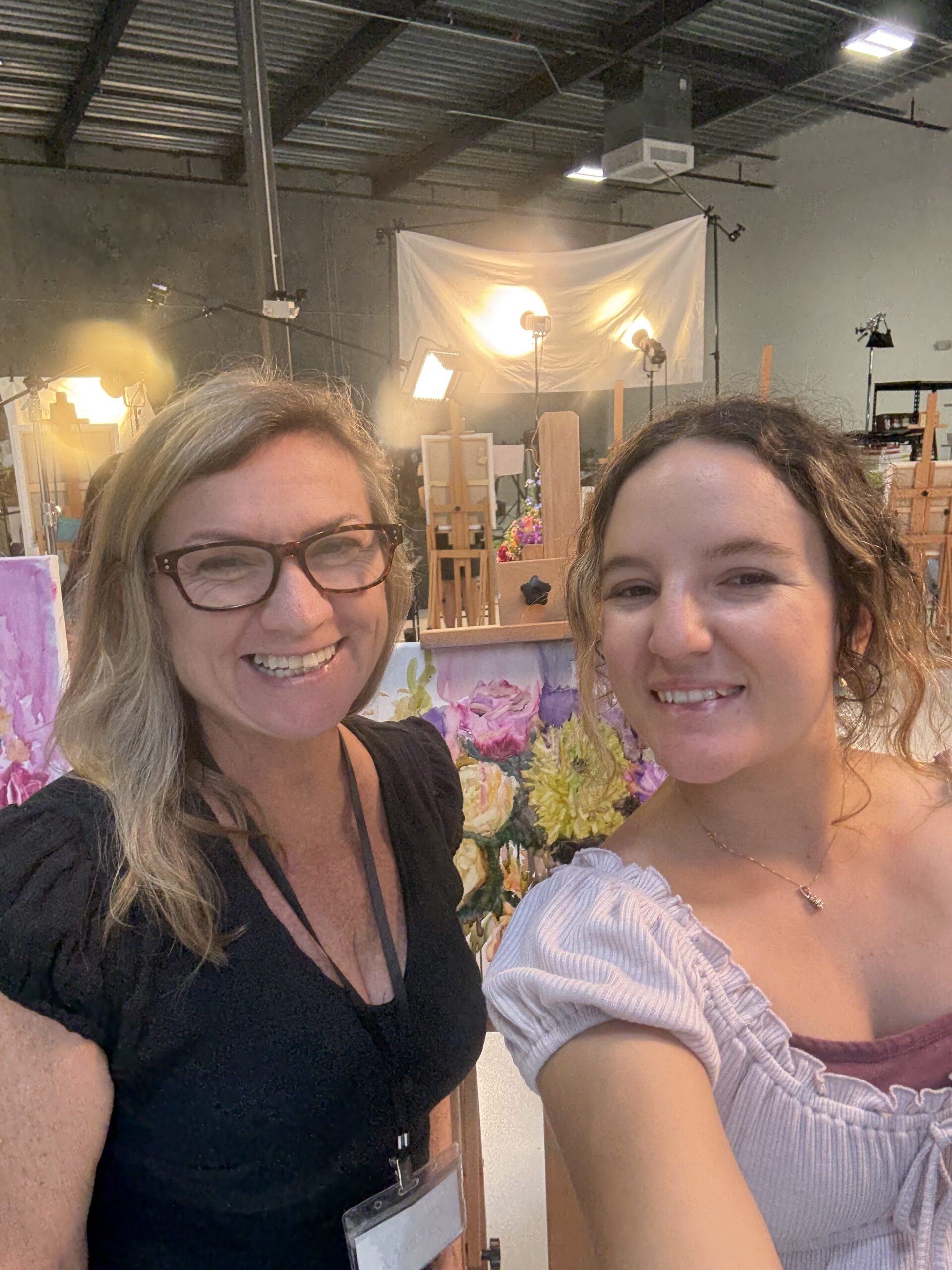 On Day One, she demonstrated for 20 minutes. They had floral arrangements we could photograph (one with a softer color scheme of pinks, whites, and creams and one with bolder purples and oranges), snacks, water, coffee, and provided all the art supplies we needed for our botanical oil painting. There were 15 easels with rolling palette stands, an acrylic primed linen canvas, tons of brushes, Milan Art oil paints sorted by warm and cool. On day one they only put out transparent paints that we used with Galkyd Lite to ensure the paintings would be dry the next day.